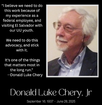 | | | In loving memory of Donald Luke Chery, Jr. “Don quietly drew people into justice work. Try as I might, I don’t recall Don issuing any demands or instructions. He just moved things along, and we stepped in next to him.” - Charlotte Jones Carrol, former Board Chair, UUSJ |