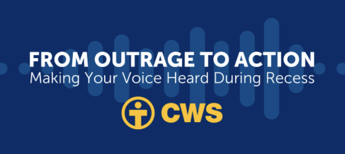 | From Outrage to Action: Making Your Voice Heard During Recess Hosted by Church World Service (CWS) August 7 1:00 p.m. ET • 12:00 p.m. CT • 11:00 a.m. MT • 10:00 a.m. PT RSVP online via Zoom The recent reconciliation bill was a devastating blow, but we are not powerless and this August is one of the most important windows for action on refugee matters: during the recess, your members will be home, holding public events, and meeting with constituents. Join us to learn how to find out when your members are in your district, and speak out. |