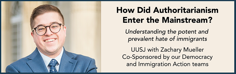 | Authoritarianism in the Mainstream If you missed UUSJ’s insightful and informative session with Zachary Mueller, Political Strategist and former Senior Director of Research at America’s Voice, on how American authoritarianism has leveraged anti-immigrant sentiment, review the video HERE. |